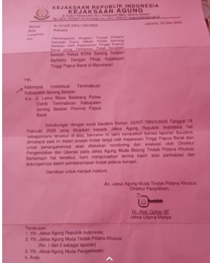 Sementara itu, berdasarkan penelusuran media, kelompok Intelektual Teminabuan juga telah menyurati Kejaksaan Agung RI pada Februari 2025 lalu. Surat balasan bertanggal 20 Mei 2025 dari Kejagung RI menyatakan bahwa laporan telah diterima dan sedang dalam proses tindak lanjut serta monitoring oleh Jaksa Agung Muda Tindak Pidana Khusus.